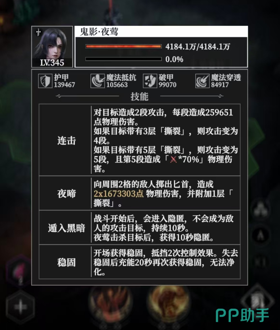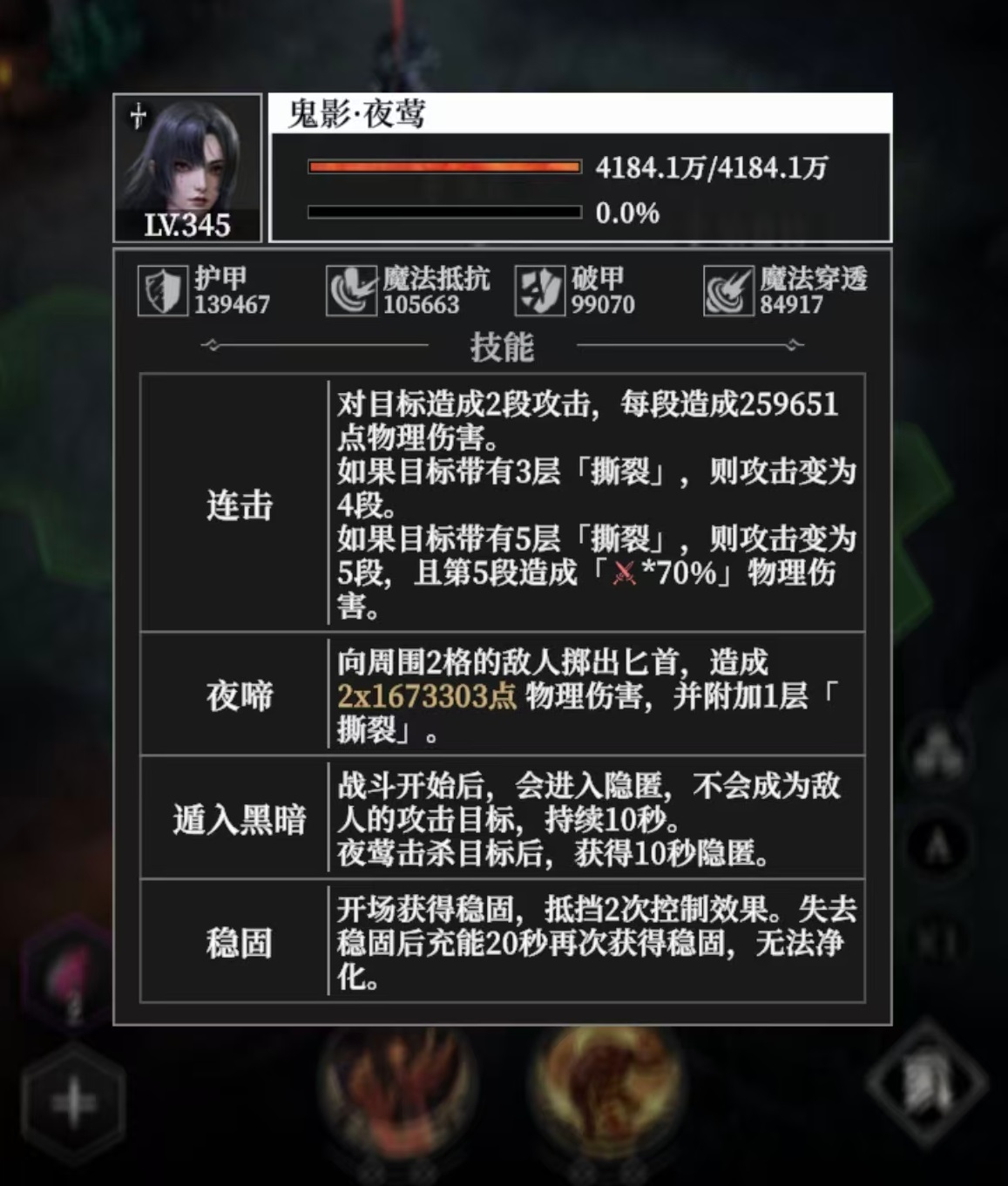 作为章节中期的重要BOSS,夜莺的战斗机制并不复杂。她的普攻附带连击效果,可造成两次伤害;若目标处于“撕裂”状态,则攻击会转化为多段输出,且撕裂层数越高,触发的额外伤害越显著。此外,她拥有“遁入黑暗”技能,战斗开始时立即进入隐匿状态,无法被敌方选中为目标。当夜莺成功击杀单位后,将再次进入持续隐匿状态,并在开局阶段自带稳固效果,免疫控制类技能。掌握这些机制后,制定应对策略就变得清晰明了。