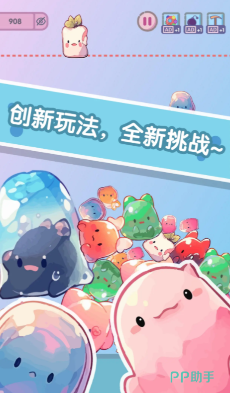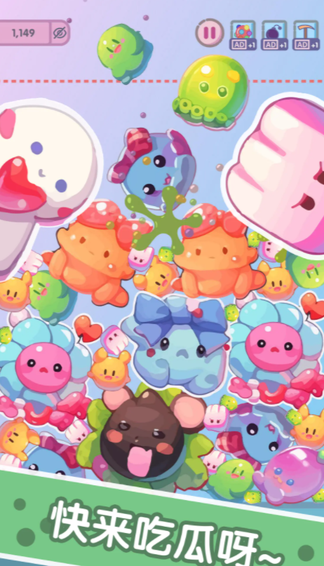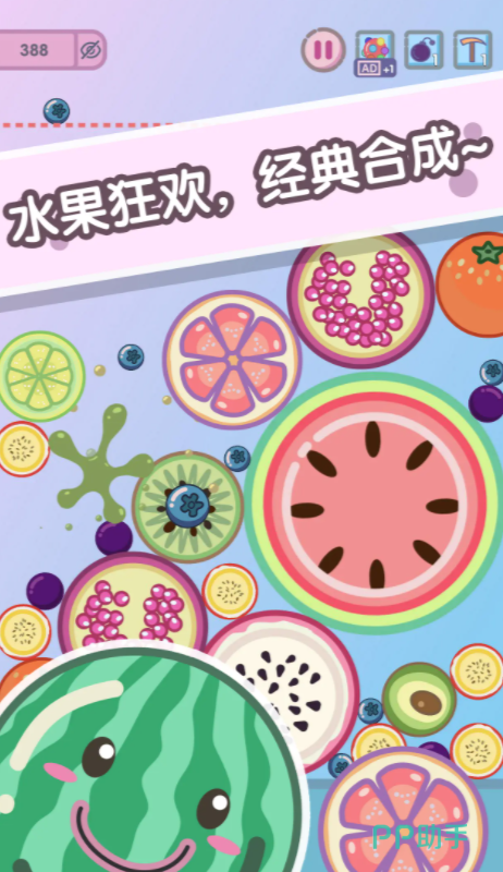 这个游戏采用的都是q版的设定,想要在这个五彩斑斓的世界中获得更多的分数,就需要合理规划这些水果的摆放位置,并且要善于利用屏幕中的空位移动这些水果,并且在游戏过程中要避免水果的堆积,否则后续其他的水果就无法再继续合成,每一次合成这些水果的占地面积会更大,这就要求玩家在游戏里提升自己的合成速度,才能获得更大的空间摆放这些水果。