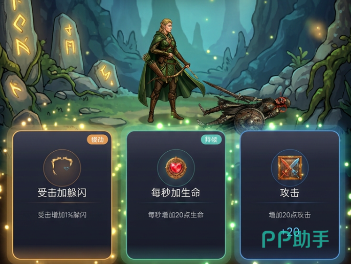 每局通关后出现的3选1强化是决定单通成败的关键节点。务必规避随机堆叠,坚持“生存优先、输出次之”的策略逻辑:固定必选+20攻击;第二顺位推荐+20生命/秒,显著延长续航能力;受击减伤与闪避类效果则依当前阶段敌伤强度动态取舍——前期小怪威胁较低,可倾向补足输出;中后期Boss压力上升,再转向防御向增益。在属性养成面板中,攻击、暴击率、吸血为三大核心成长维度,金币投入应集中于此;攻速维持在1.0秒左右即可,无需刻意压缩,避免资源错配。技能配置分阶段演进:前期启用跟踪毒箭+蓄力强袭,兼顾持续伤害与爆发压制。