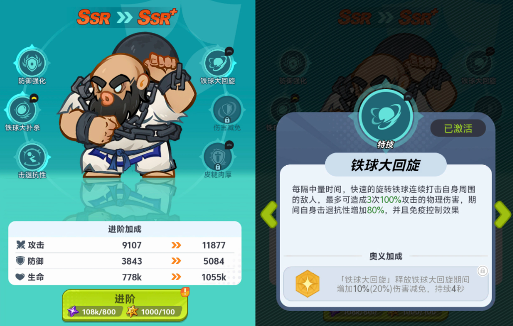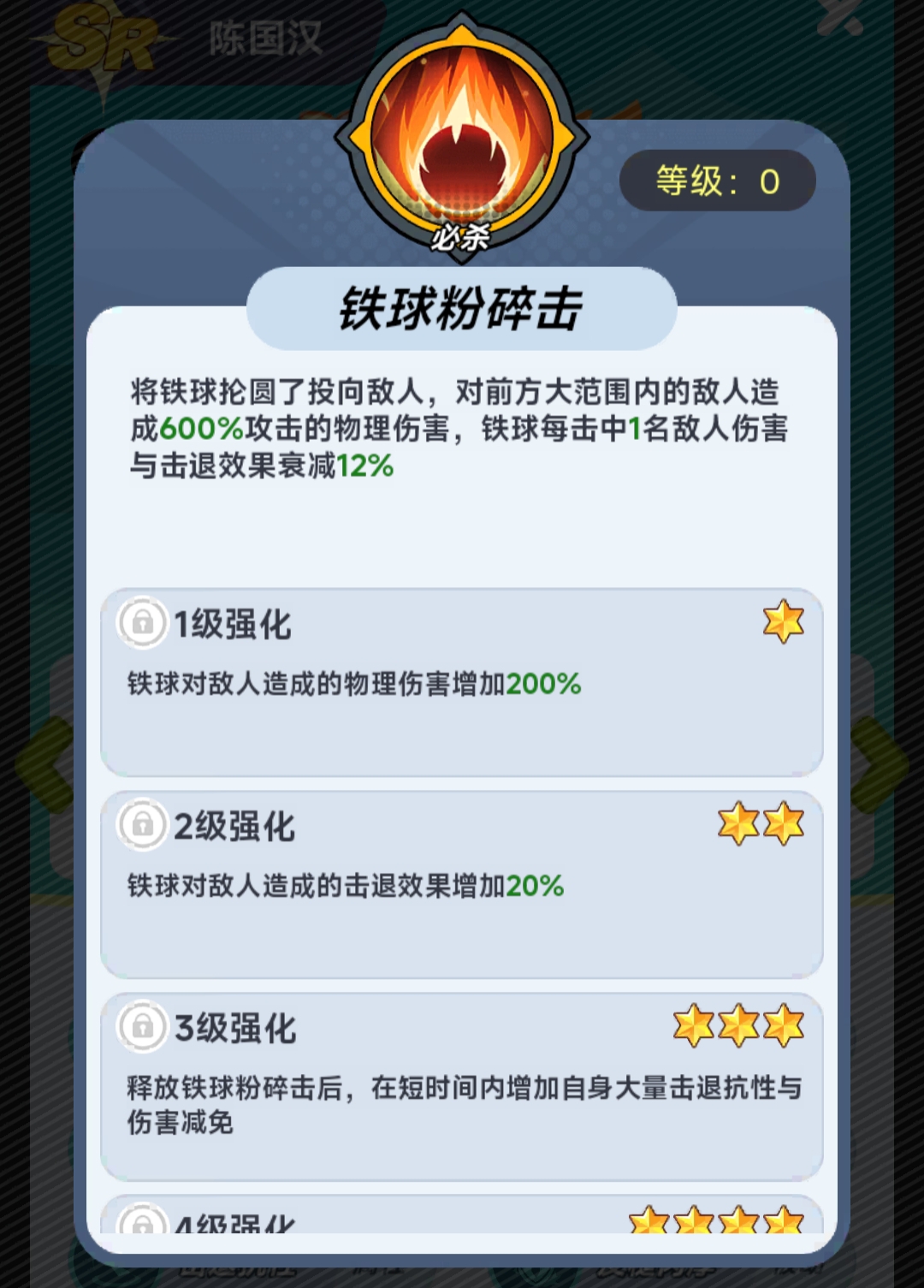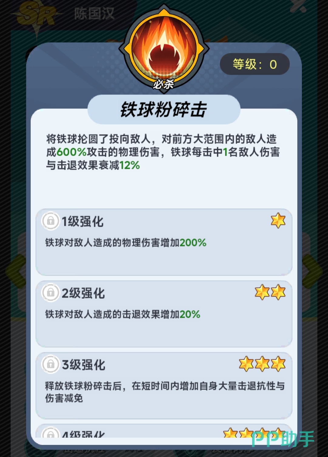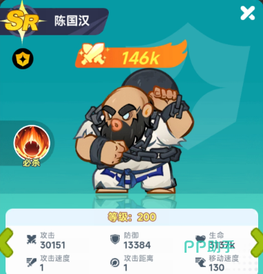 该角色虽沿用《拳皇》经典形象设定,但在《最强斗王》中采用Q版建模,体态圆润、表情生动,在保留原有力量感的同时强化了亲和力与辨识度。基础属性方面,陈国汉拥有全角色梯队中领先的物理减伤率与最大生命值成长系数;技能组包含短CD范围伤害技,并随星级提升解锁“抗击退”机制——该效果可有效防止关键前排被击飞/击退,显著提升阵型完整性与输出环境稳定性。