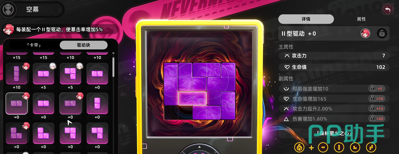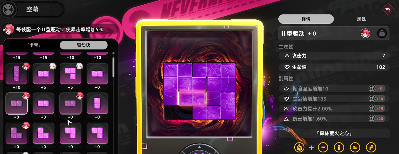 角色养成体系围绕战力进阶展开,设有多个相互关联的成长路径。其中“空幕系统”为核心机制之一,由卡带与驱动块两大组件构成,采用类俄罗斯方块的空间布局逻辑。玩家需依据战斗需求,在限定格数内优化卡带插槽配置与驱动块嵌入顺序,从而实现属性加成、技能联动与战术协同的最大化输出效率。