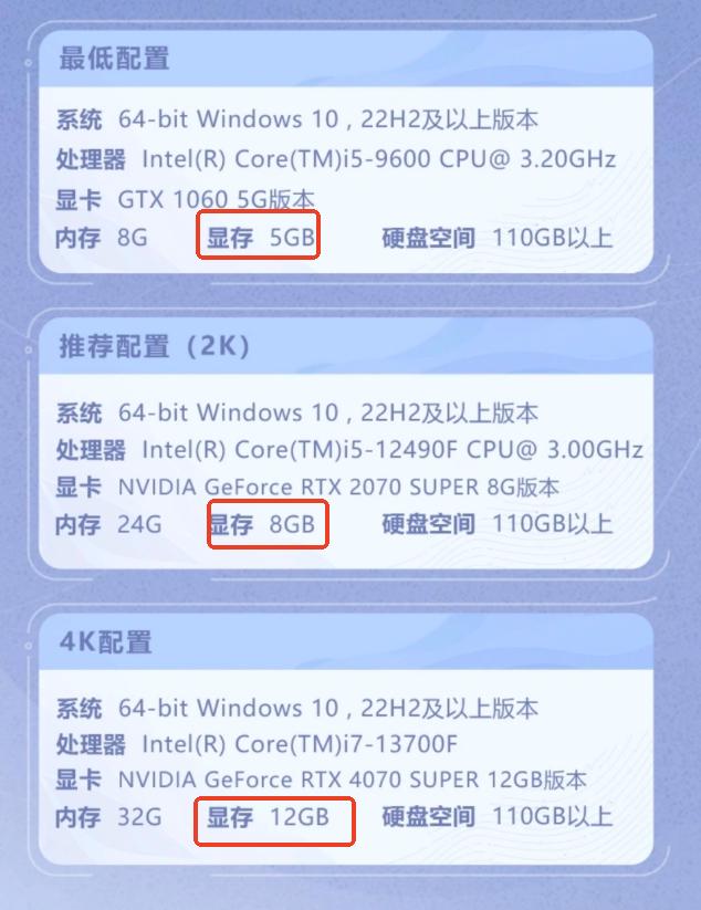 硬件性能未达最低运行门槛是另一主要诱因。根据官方公布要求,PC端需满足8GB内存、配备显存不低于5GB的GTX 1060级别显卡,并预留至少110GB可用存储空间。若显卡显存不足,将显著影响场景加载与角色模型渲染效率,表现为启动失败或加载界面长时间无响应。