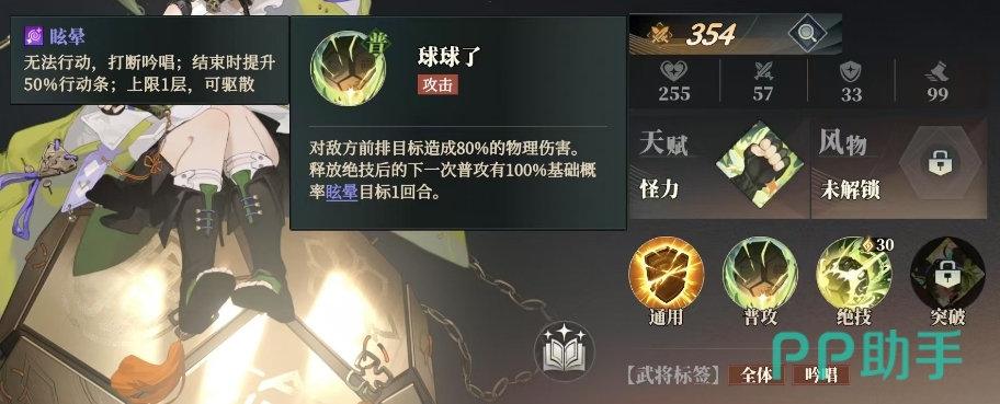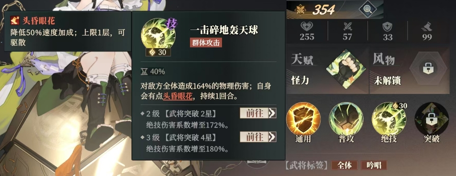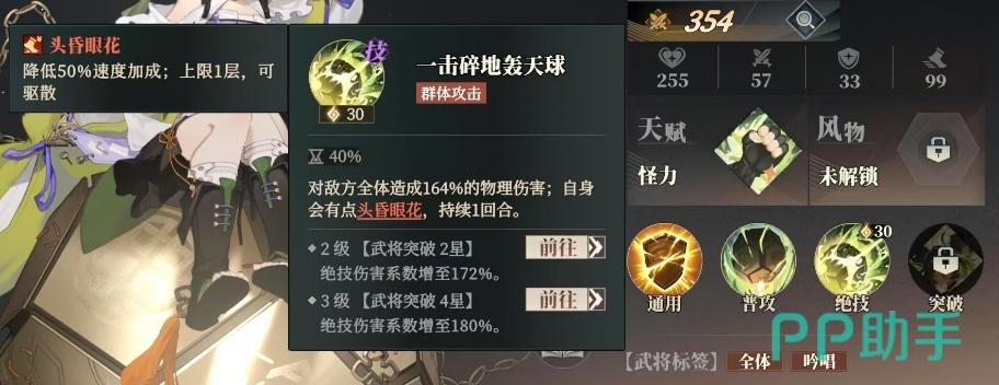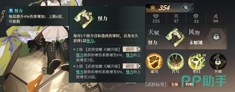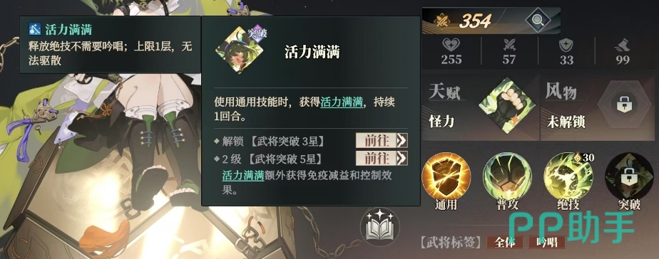 除了强大的攻击力外,关银屏还拥有一项独特的突破技能叫做活力满满,在3星的时候就可以解锁这个技能,在使用通用技能时,关银屏会获得活力满满的状态,持续1回合,活力满满的效果是释放绝技不需要吟唱,提高了她在战斗中的灵活性,而且这个状态上限只有1层,无法被驱散,当关银屏突破至2级武将突破5星时,活力满满还能额外获得免疫减益和控制效果。