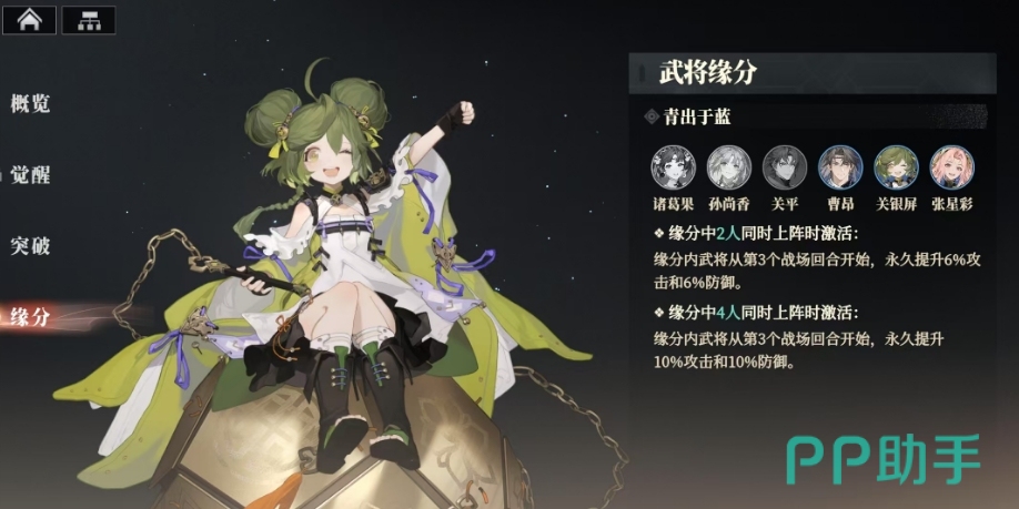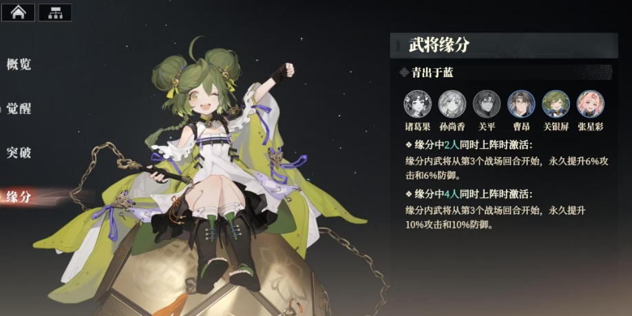 她的缘分与关平一样,都是青出于蓝的羁绊效果,这个缘分涉及到的武将有诸葛果、孙尚香、关平、曹昂、关银屏以及张星彩,当缘分中2人同时上阵时,他们会从第3个战场回合开始,永久提升6%的攻击和6%的防御,这种提升不仅增强了关银屏自身的战斗力,也让她在团队中发挥了更大的作用,而当缘分中4人同时上阵时,他们则会从第3个战场回合开始,永久提升10%的攻击和10%的防御,所以关银屏不仅拥有一些个人能力,还能通过与其他武将的配合发挥出更大的战斗力。