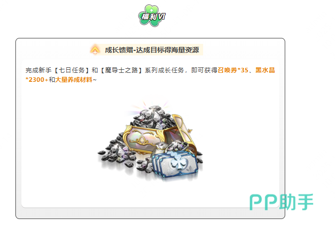 第六项为成长回馈机制。玩家只需完成新手七日任务与“魔导士之路”系列目标,即可获得大量用于角色培养的素材、召唤券以及黑水晶,助力快速提升战力。