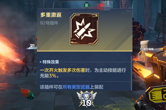 实现“无限狂热”的关键在于能量循环闭环。首选配件为2号插件【多重激返】:每次开火若造成有效伤害,即可为“极速狂热”技能恢复3%能量。在高密度敌人环境中,此效果可高频触发,使能量槽维持高位,大幅延长主动技持续时间,从而规避技能真空期,形成稳定输出节奏。