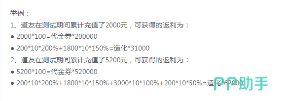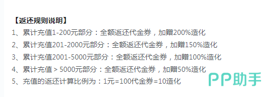 测试期间所有的充值在公测的时候都会以代金券的形式全部的返还。而且还会根据充值的金额去额外的加赠造化,具体的规则是累计充值一元到200元,全额可以返回代金券,额外还可以获得200%的造化。充值如果超过5000元的这一部分就可以全额的返回代金券,而且还可以获得50%的造化。