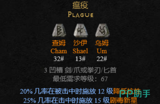 在游戏内也有不少适合刺客和盗贼的装备,例如瘟疫符文,他们分别由查姆、沙伊、乌姆组成,能够镶嵌在剑或者是匕首的插槽上,最低等级要求是67级,能够在被击中时释放剧毒猩猩,对敌人造成毒属性的低buff伤害,在每一次进行伤害之后,玩家都能够再次获得一次抗性的加成,但是这个套装并不适合前中期玩,因为在前期和中期玩家的血量比较低,可能配备了这样的符文之后,会不足以抵抗敌人的攻击。