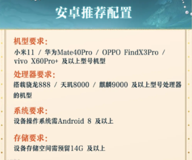 是对手机配置并没有太高的要求,如果是iOS版本, a14以上处理器即可,如果是安卓版本,处理器方面主要选择天玑8000,麒麟9000,设备操作系统起码需要安卓8以上。设备储存的空间要预留14G及以上。