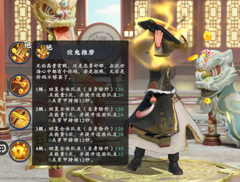 “役鬼推磨”为武师专属高阶功法,共设四级进阶体系。一级状态下可为全体队友恢复120点能量,持续触发5次;随等级提升至二级、三级、四级,能量回复量与触发稳定性同步增强。该功法在卡牌阵容协同作战中具备显著战术价值,合理规划释放时机,能大幅压制敌方节奏,实现以巧破力的战斗效果。