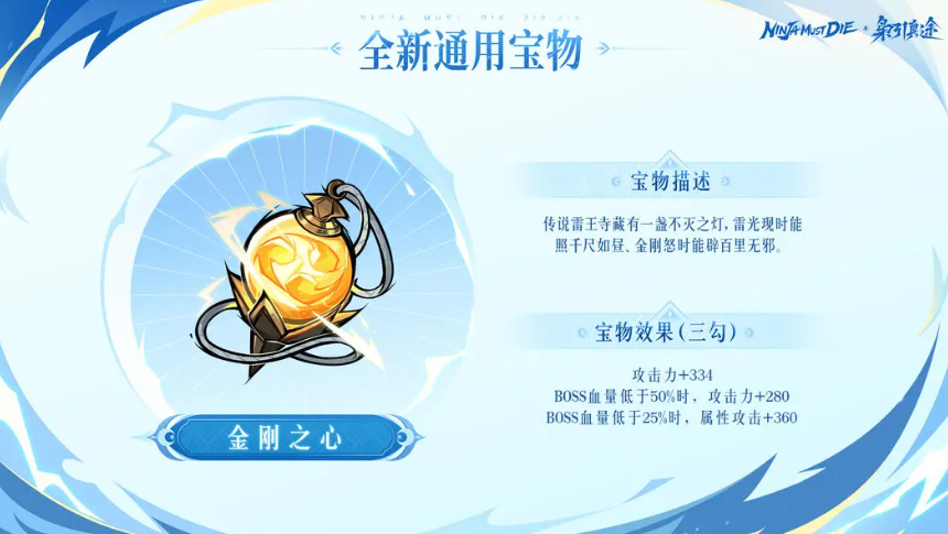 全新通用宝物【金刚之心】同步实装。该宝物原型取自雷王寺不灭之灯,基础属性为攻击力+334;当BOSS血量低于50%时,额外提升攻击力280;血量低于25%时,进一步激活属性攻击+360效果。获取途径为限时玩法【华光藏宝图】活动。
