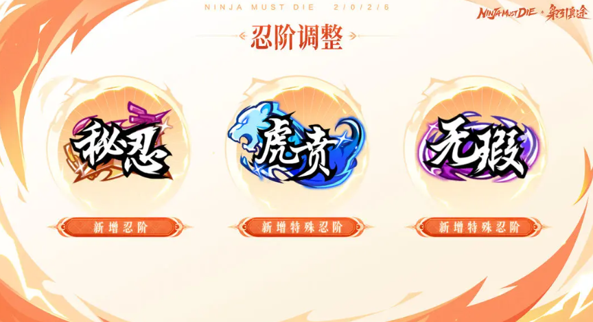 忍阶系统迎来重要扩展,新增三大进阶层级:【秘忍】【虎贲】【无瑕】。其中【秘忍】为禁忍之上可挑战的最高忍阶,升阶成功将发放金钥匙等奖励;【虎贲】为鹰扬进阶形态,需满足24名作战忍者命格均达6层方可解锁;【无瑕】为神行者进阶形态,通关220关故事模式且全程无伤即可激活。