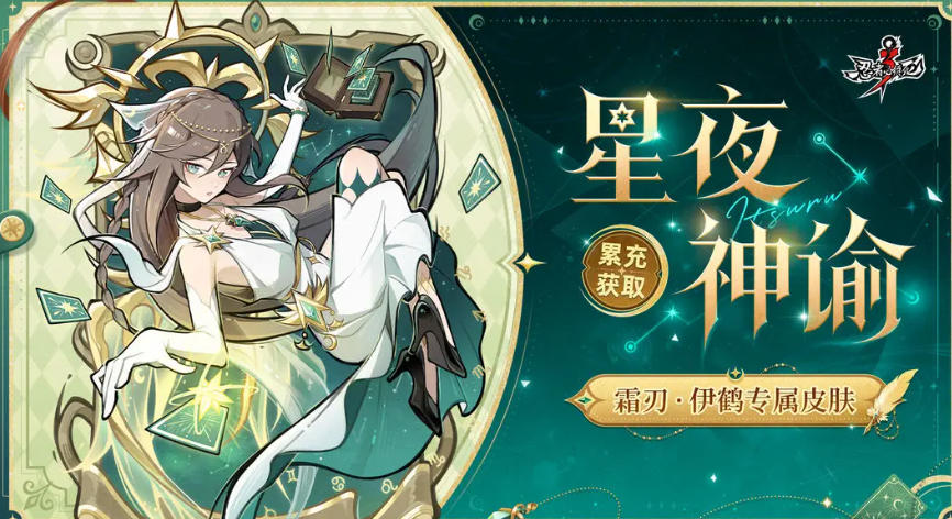 首推外观为伊鹤专属皮肤【星夜神谕】,该皮肤通过累计充值解锁,角色身着素白纱裙,头戴星芒冠冕,周身环绕塔罗牌元素,整体设计融合神秘学意象与庄严仪式感,凸显其在忍界中的特殊位格。