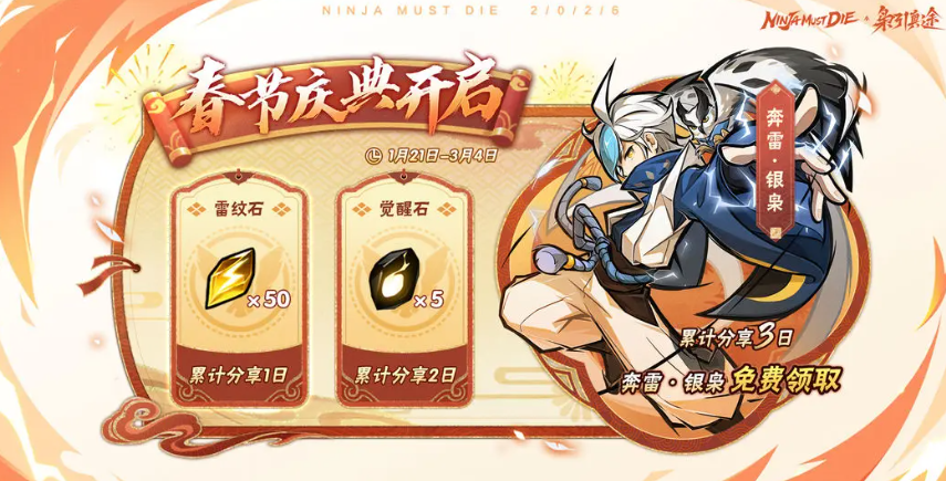 春节限时福利同步开启,活动周期为1月21日至3月4日。玩家完成连续3天分享任务,即可免费获得联动忍者【奔雷·银枭】;参与“共观雷动”签到活动,每日登录可领取【雷弈·银枭】角色碎片40枚、限定十连金钥匙等关键资源。