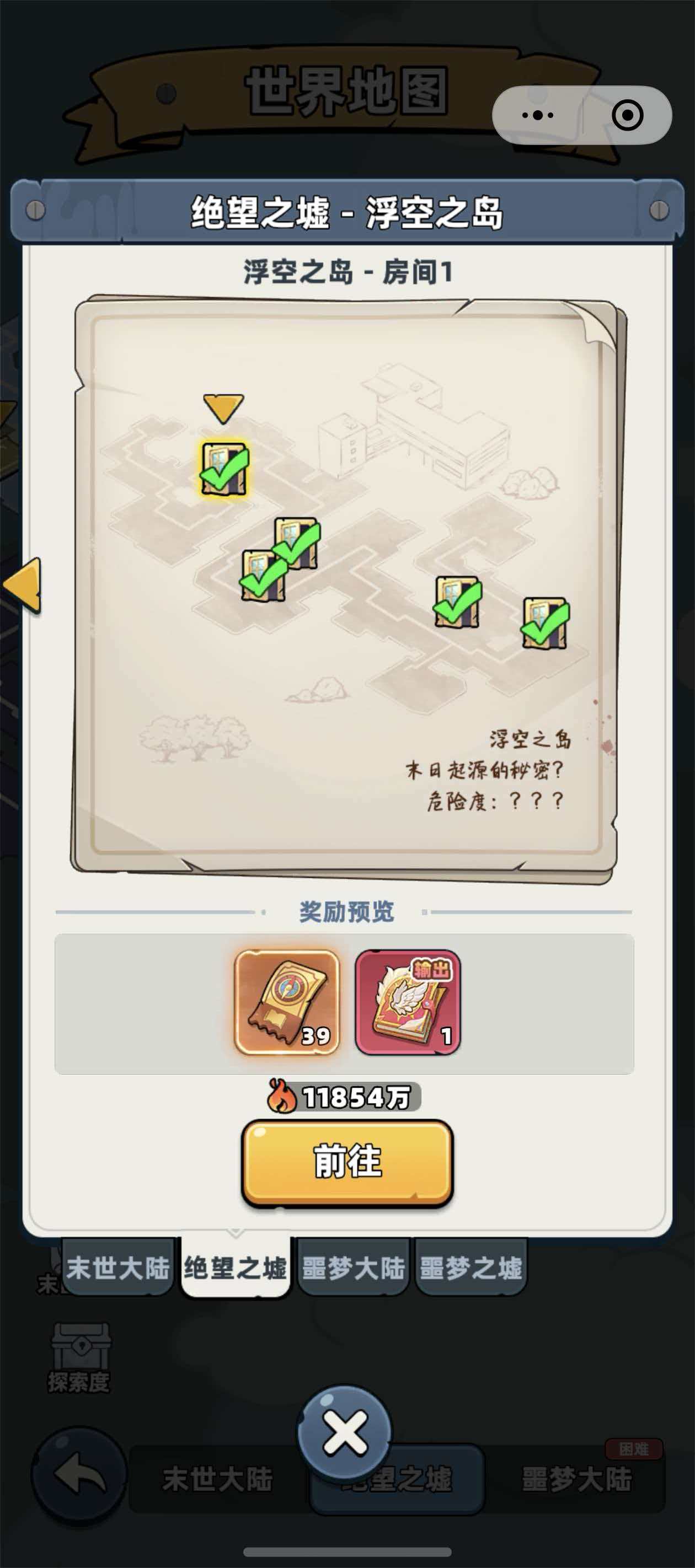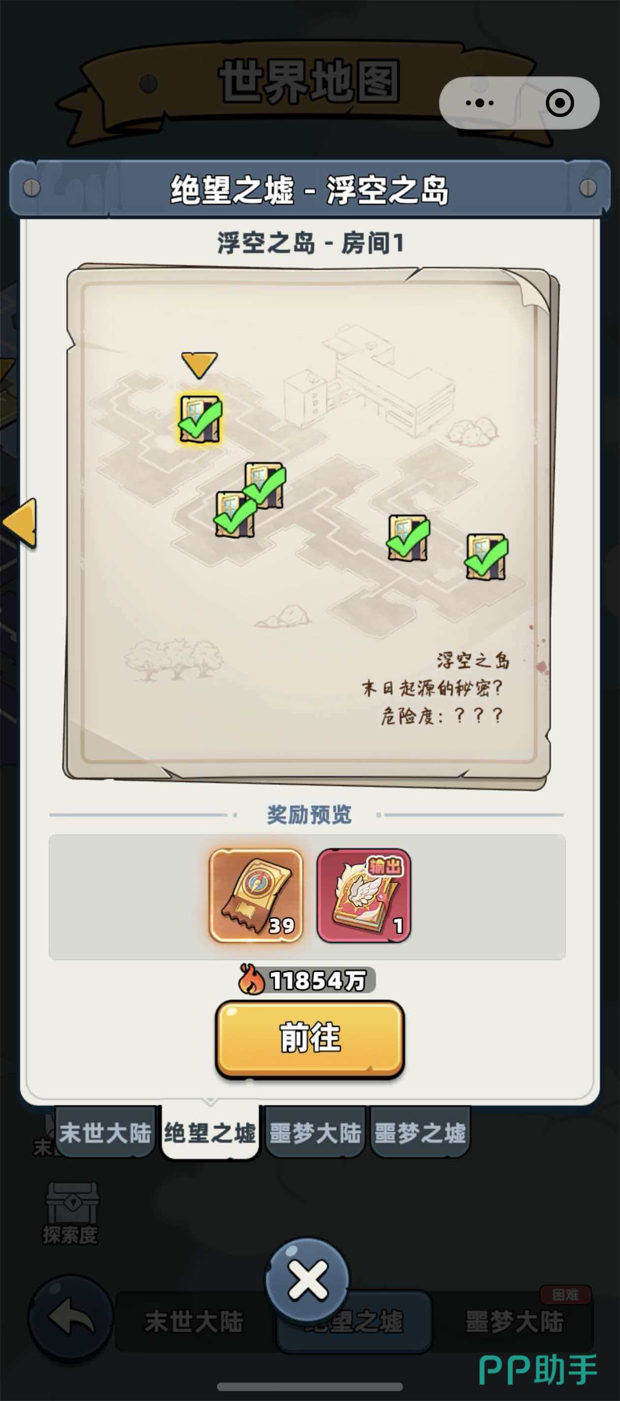 除Boss战外,浮空之岛的房间探索同样是核心玩法。全图划分为多个独立房间,每个房间均设有明确的战斗力准入门槛。玩家需实时比对自身战力数值与房间标注要求,战力不足将导致探索失败或遭遇极高难度敌人。成功完成房间探索后,可稳定获得高级材料、稀有装备图纸及限定皮肤碎片等奖励。值得注意的是,部分房间在常规视角下不可见,仅显示于世界地图,此时必须装配“灵异照相机”技能书方可显现其真实位置并进入探索。该技能书为解锁全图100%区域的必要道具,不可省略。