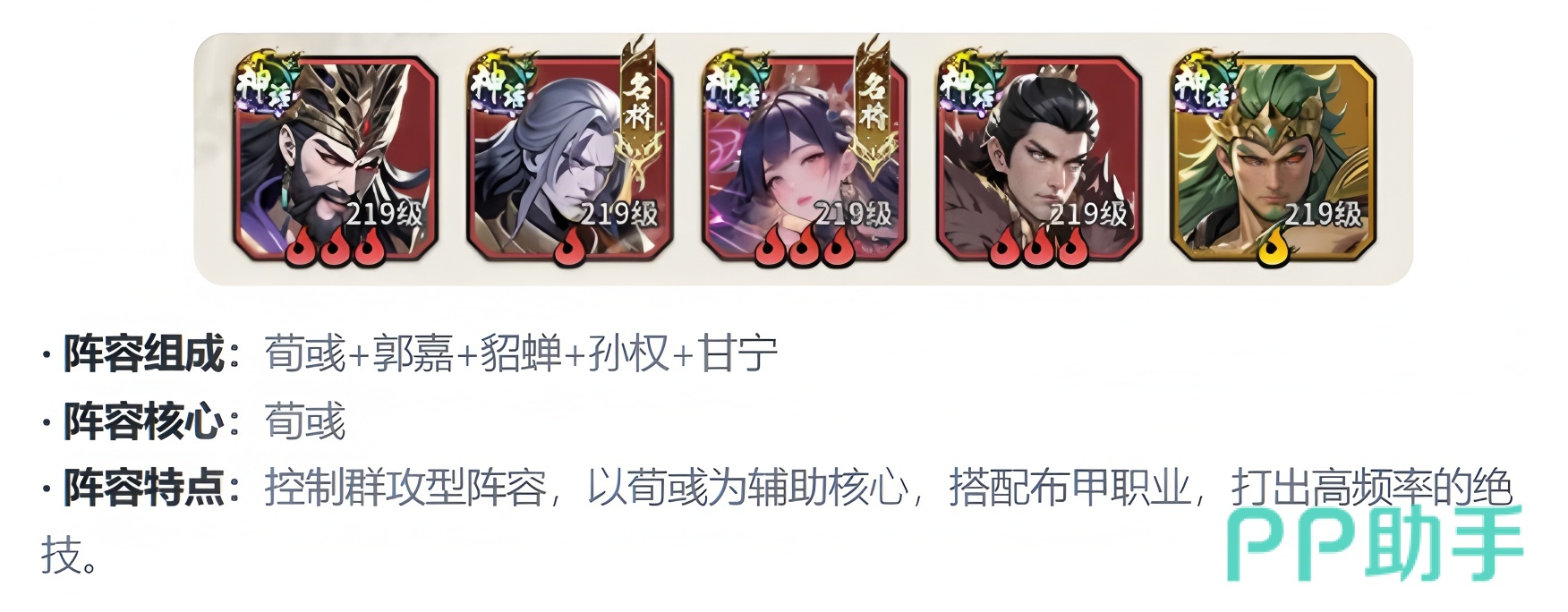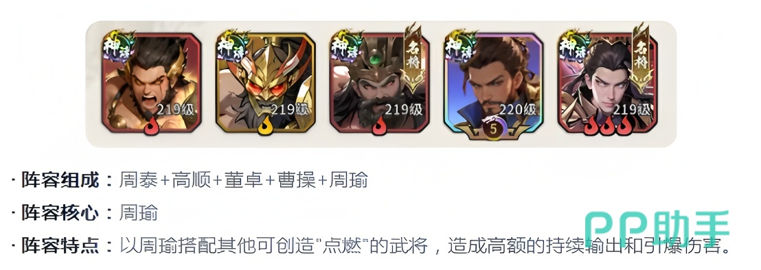 第四套主打元素连锁:周瑜为核心,辅以董卓(火系增伤+范围眩晕)、高顺(列阵强化+减怒)、曹操(怒气管理+暴击联动)、周泰(濒死反伤+火属性额外加成)。借助周瑜“点燃”机制,可对已附着火种的目标触发爆炸伤害,形成多层叠加的递增式输出曲线。