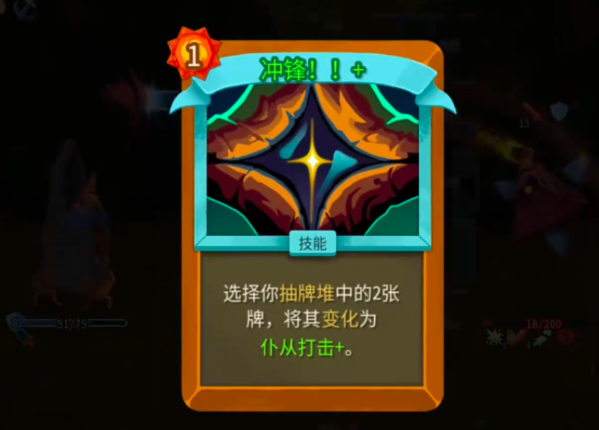 在保障资源循环的同时,牌库精简同样关键。储君初始牌组冗余度高,低效卡过多将直接拖慢循环节奏。“冲锋!!”是当前版本最优解:0费发动,指定弃置抽牌堆顶两张牌,并将其转化为两张“仆从打击”。后者为0费瞬发卡,每张造成10点固定伤害,兼具高效过牌、精准删减与稳定输出三重价值,是提升整套卡组运转效率的核心润滑剂。