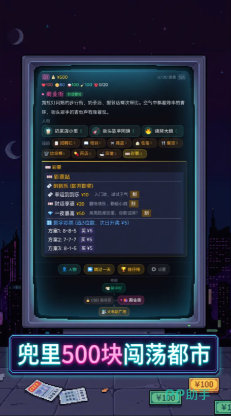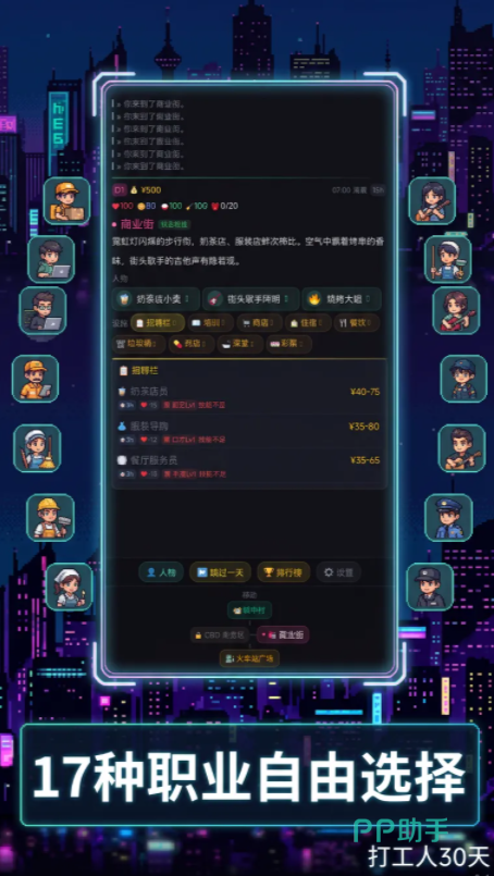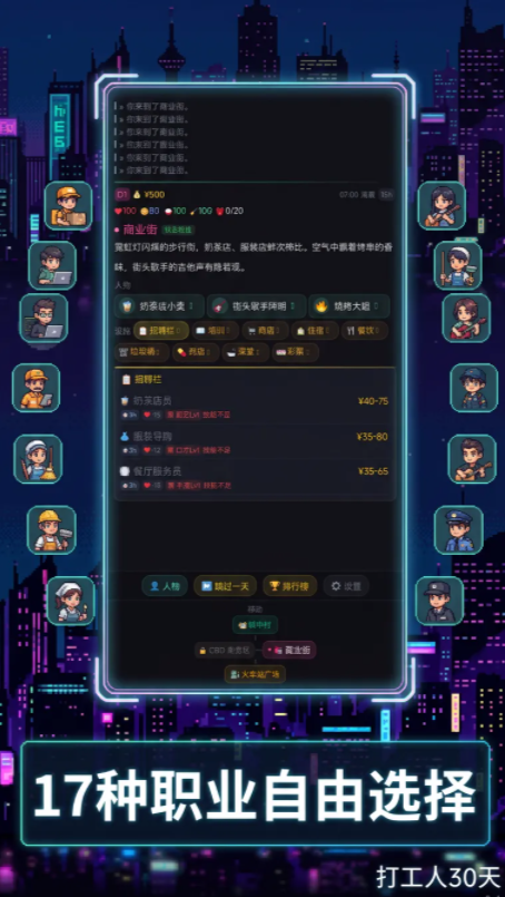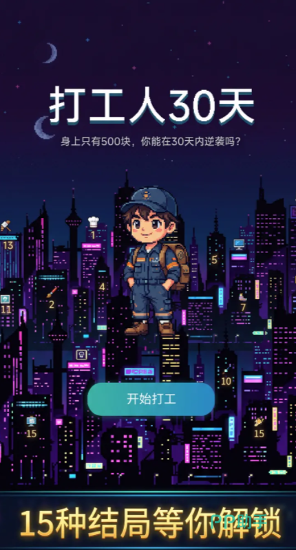 游戏开局即设定强约束条件:玩家扮演一名离乡赴城的应届生,初始资金仅500元。在完全陌生的都市环境中,必须于30个游戏日内完成基础生存闭环——首日需完成租房(影响后续健康值与通勤耗时),次日启动求职流程。因角色初始学历与技能等级受限,仅能应聘保洁、快递分拣、便利店夜班等底层岗位;每份工作对应固定日薪、体力消耗及随机事件触发概率。积累初始资本后,可解锁技能进修模块或更换居住环境,从而提升属性成长效率与事件抗风险能力。