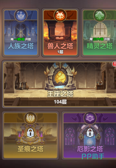 其余五种塔需先解锁皇座之塔特定层数方可激活。例如人族之塔、精灵之塔和兽人之塔,必须通关皇座之塔第100层才能开启,并设有固定开放时间。人族之塔每周一、周四、周日开放,仅允许人族角色出战;兽人之塔于每周二、周五、周日开放,仅限兽人单位上阵;精灵之塔则在每周三、周六及周日开放,仅能使用精灵阵营英雄。而厄影之塔与圣痕之塔门槛更高,需通关皇座之塔200层后才可解锁,且对出战英雄有特殊限制,但无固定开放时段,解锁后可随时挑战。