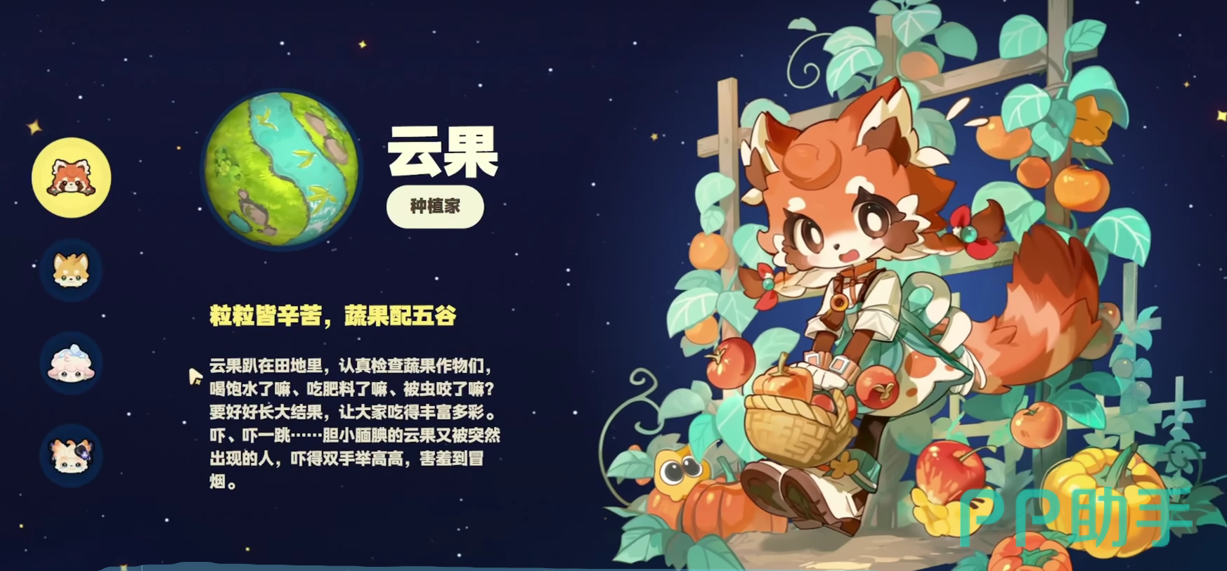 第一位登场的角色名为云果,原型灵感来源于一只灵动的小狐狸,整体造型偏向火狐风格。他性格内向、略带羞怯,但拥有极高的种植天赋,职业定位为种植家。在游戏中,云果能协助玩家高效培育各类农作物,并负责照看田地,提升作物产出效率,是打造繁荣农场不可或缺的得力帮手。
