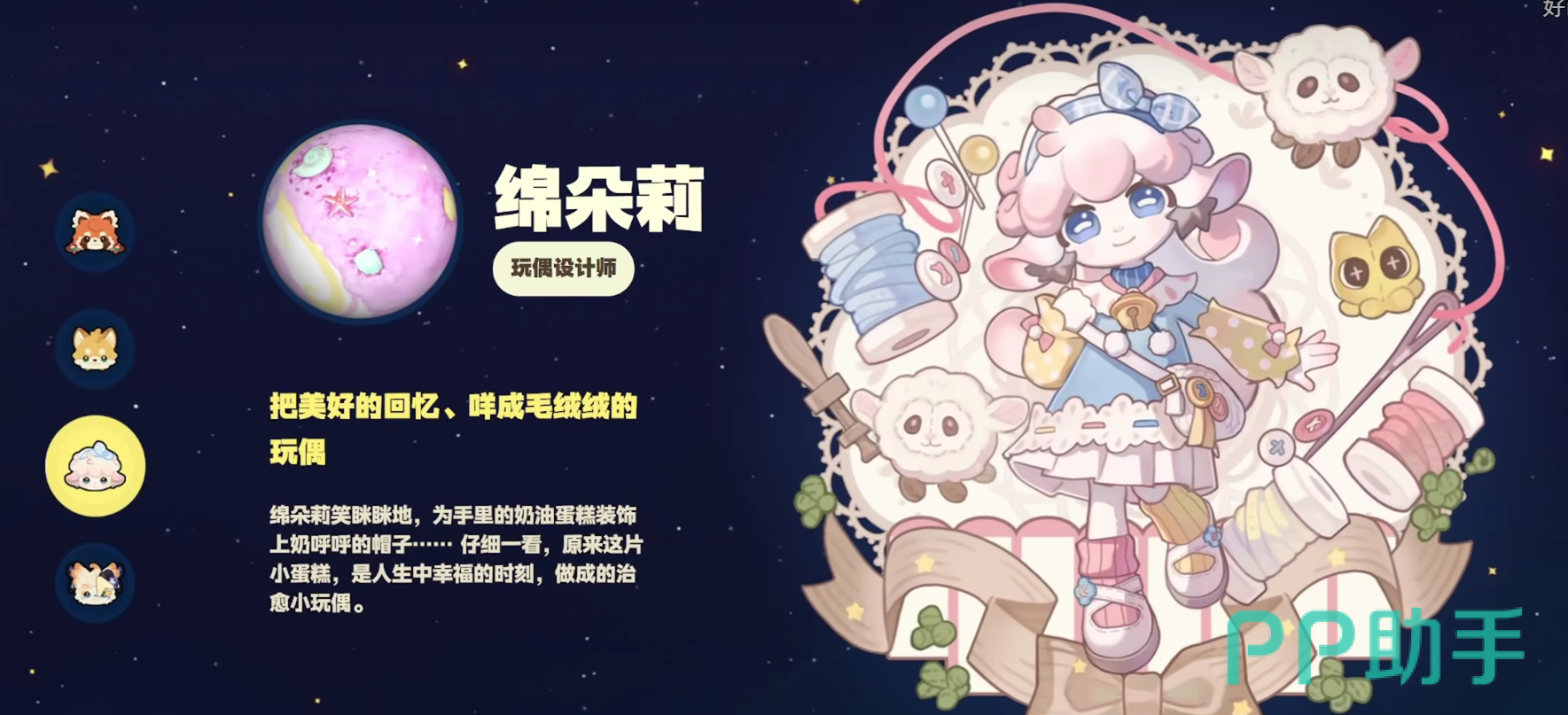 第三位角色名为绵朵莉,形象软萌可爱,原型取自绵羊,整体配色以粉色为主,充满童趣与温暖感。她的职业是玩偶设计师,精通针线工艺,在游戏的服装定制与手工制作系统中扮演关键角色。玩家若想创造独特的服饰或玩偶,少不了她的专业协助。她用一针一线将美好记忆具象化,是一位富有创造力的伙伴。