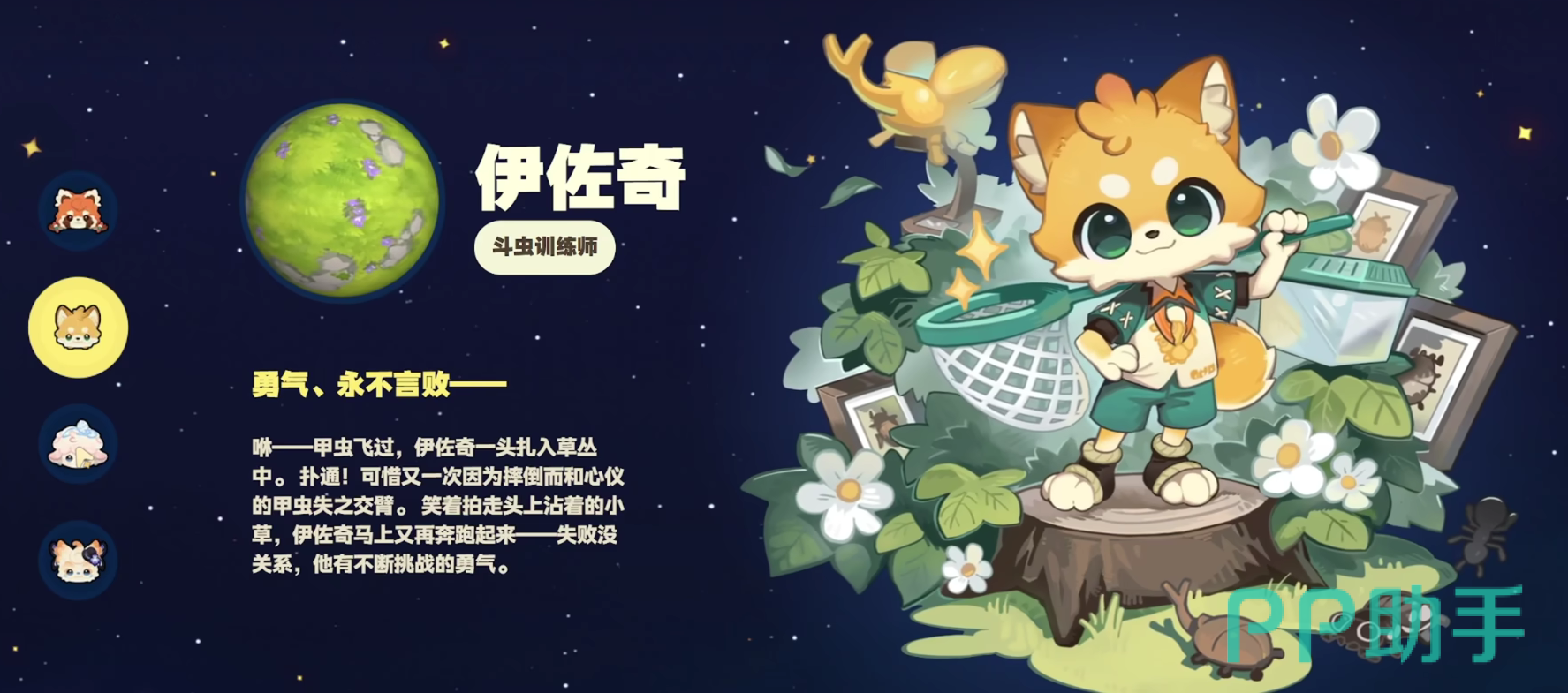 第二位角色伊佐奇同样以狐狸为设计原型,但与云果不同的是,他是一只浅黄色毛发的狐狸,性格阳光开朗,职业设定为斗虫训练师。他在游戏中可以帮助玩家驱赶有害昆虫,同时在探索未知区域时给予勇气支持。擅长使用捕虫网捕捉稀有昆虫,无论是外观还是功能都极具吸引力,是冒险旅程中理想的同行伙伴。