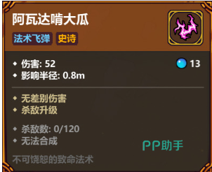 阿瓦达的基础伤害为52,影响范围半径为0.8米,属于无差别群体伤害类型,核心优势在于“杀敌升级”机制。首次升级需累计击杀120只小怪,第二次则需要再击杀240只。值得注意的是,在第一次升级过程中,部分怪物的击杀可能不会被系统计入统计,导致进度缓慢;但从第二次升级开始,所有击杀都会被完整计算,刷新效率明显提升。