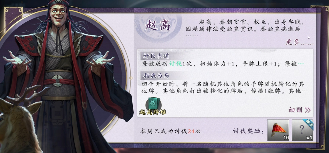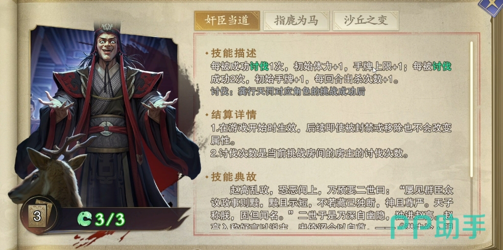 先来说说赵高的第一大技能奸臣当道,这可是一个非常棘手的技能,它具备越战越强的成长属性,随着战斗的持续进行,其威力会不断增强,每次赵高被击败后,就会激活一系列隐藏属性,这些隐藏属性分为不同的阶段,当第一次被讨伐成功后,他就会增加1点体力上限以及手牌上限,这意味着他在后续的战斗中将拥有更雄厚的生命储备和更多的手牌资源,并且手牌的选择也变得更加丰富。