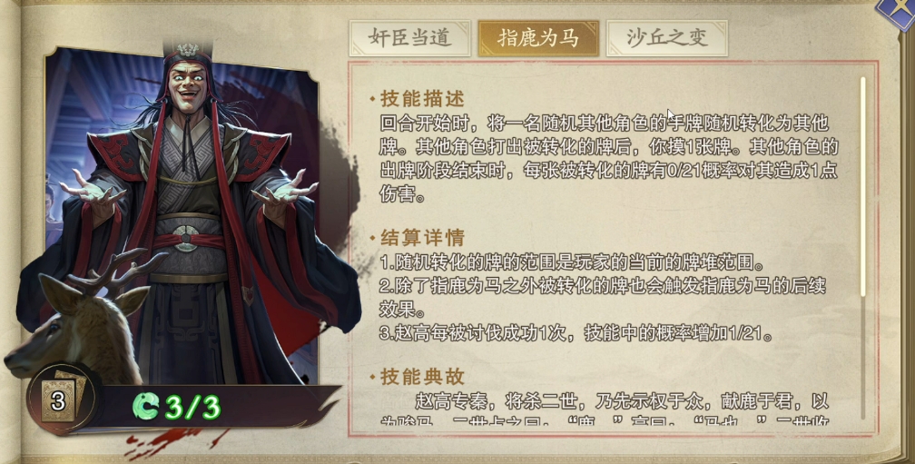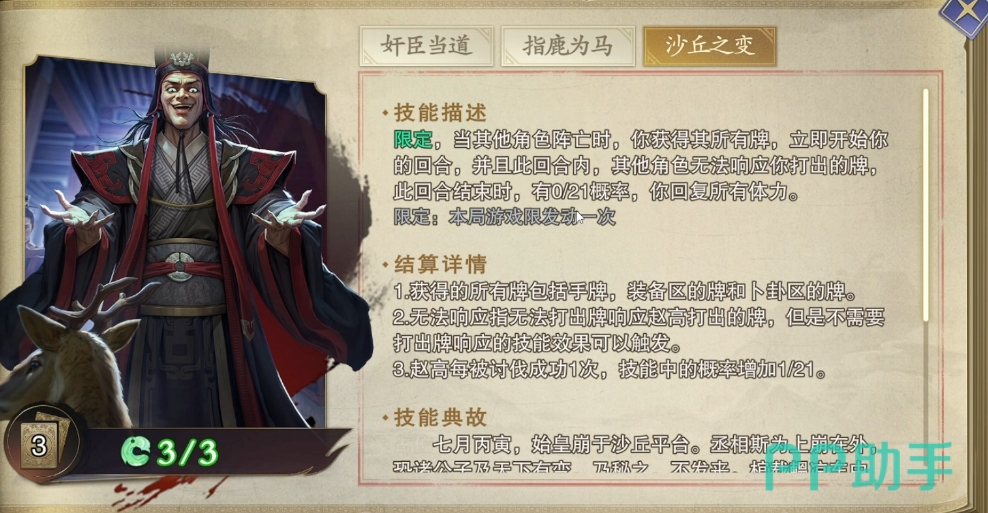 技能三叫做沙丘之变,堪称赵高最为恐怖的终极杀招,当战场上的局势陷入胶着,有队友不幸倒下之时,赵高便会掠夺其全部家当,无论是珍贵的手牌、强力的装备还是关键的卜卦牌全部夺走,紧接着他会开启暴走回合,此期间所有玩家都只能看着他出牌,当这个暴走回合结束时,赵高还有可能满血复活,所以建议这个时候大家最好是速战速决。