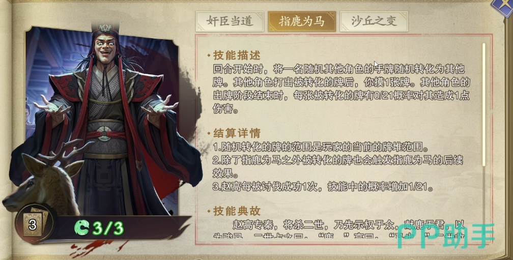接下来要着重讲讲他的第二大技能叫做指鹿为马,这个技能属于卡牌陷阱的效果,在游戏开局之时,赵高就会对玩家们的手牌进行随机改造,当玩家在使用那些被魔改过的卡牌时,赵高便会从中摸取一张牌,从而扩充自己的手牌资源,到了后期赵高的优势便逐渐凸显出来,且这里每张被改造的卡牌它们都有一定概率在回合结束时反噬主人,不过破解这个效果的方法也是有的,只要玩家们在游戏过程中足够细心,注意观察卡牌变化提示,就会发现那些被改造的卡牌上会显示出特殊的标记,这些标记就是识破陷阱的关键线索,玩家们可以根据这些线索提前做好应对准备。