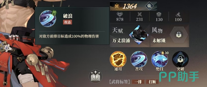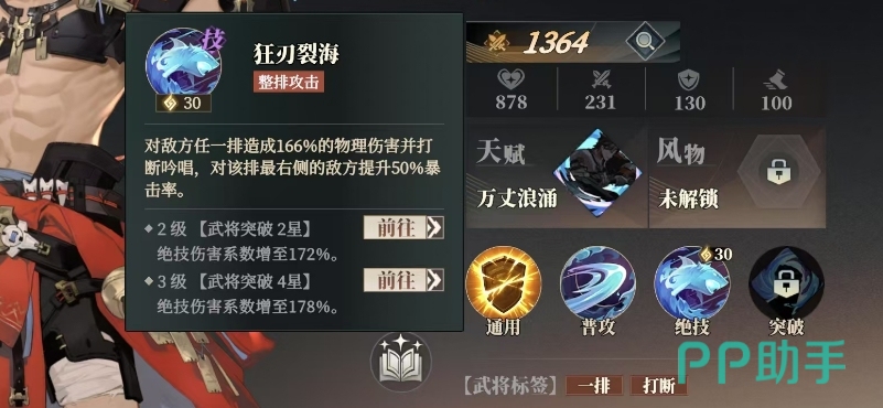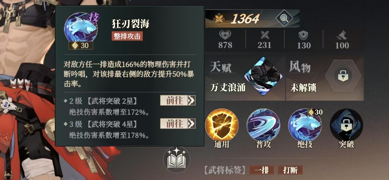 甘宁的普攻名为破浪,这一技能具有强大的冲击力,当他施展破浪时,能够对敌方前排目标造成100%的物理伤害,而他的绝技狂刃裂海更是威力惊人,当甘宁释放这一绝技时,能够对敌方任一排造成166%的物理伤害,而且,这一绝技还具备打断敌方吟唱的效果,在关键时刻能够打乱敌人的战术部署,此外,对于该排最右侧的敌方单位,还会提升50%的暴击率,让敌人在毫无防备的情况下遭受到甘宁的输出。