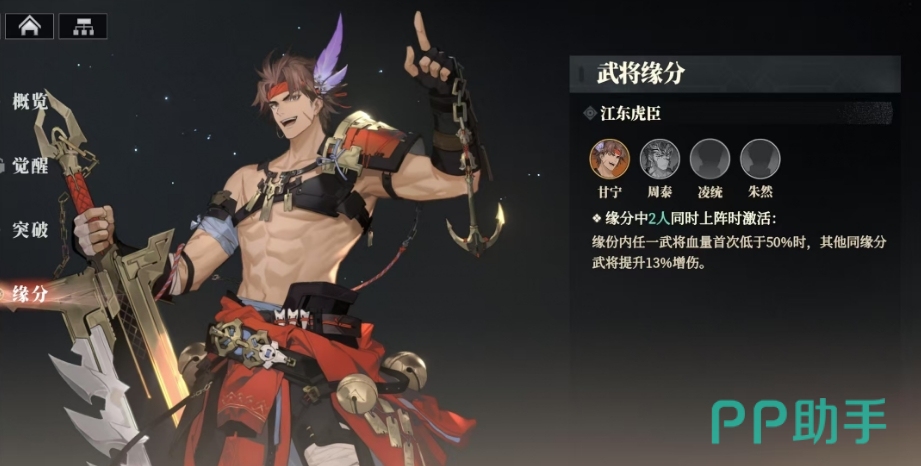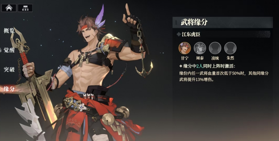 甘宁的武将缘分是江东虎臣,与他有着紧密羁绊的是周泰、凌统和朱然,当其中任意两人同时上阵时,便会激活特殊的缘分效果在,战斗中只要缘份内任一武将的血量首次低于50%,其他同缘分的武将就会获得13%的增伤效果,提升了他们在战场上的生存能力和攻击力。