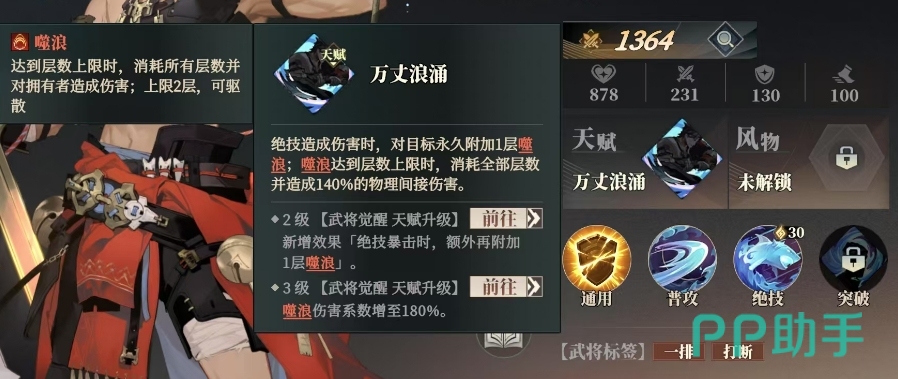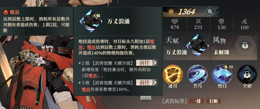 甘宁的天赋名为万丈浪涌,这是当甘宁使用绝技造成伤害时才可以用到的效果,会对目标永久附加1层噬浪效果,而当噬浪达到层数上限时,会消耗全部层数并对敌人造成140%的物理间接伤害,在2级武将觉醒天赋升级后,万丈浪涌获得了进一步的强化,当甘宁的绝技暴击时,会额外再附加1层噬浪效果,这让他的伤害输出更加恐怖,而当达到3级武将觉醒天赋升级时,噬浪的伤害系数提升至180%。