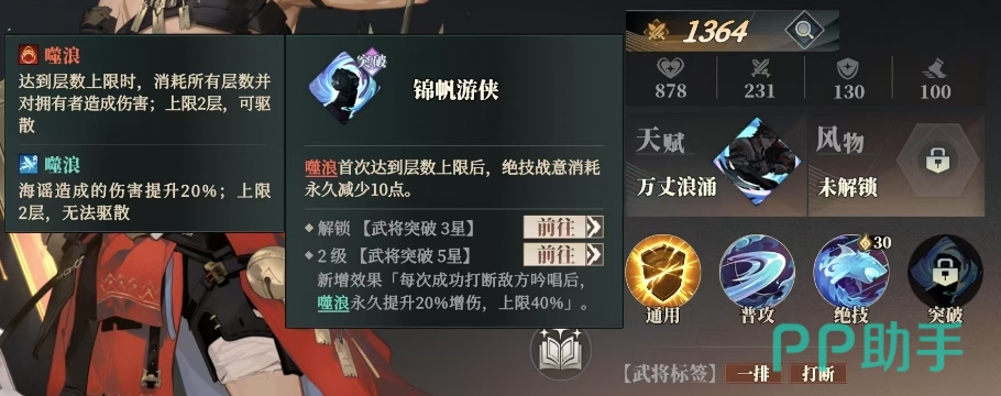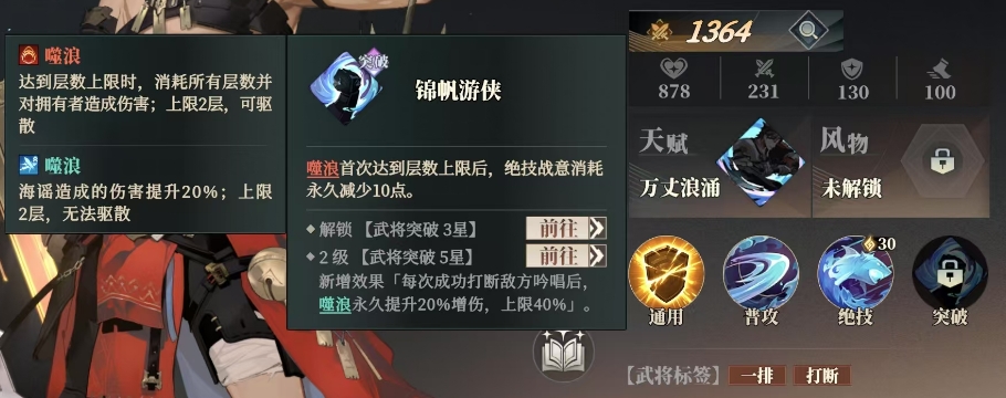 甘宁的突破技能名为锦帆游侠,当他的噬浪技能首次达到层数上限后,绝技战意消耗会永久减少10点,这一技能效果使得甘宁在战斗中能够更加频繁地释放绝技,从而对敌人造成更大的伤害,当甘宁达到2级武将突破5星时,每次成功打断敌方吟唱后,噬浪技能会永久提升20%的增伤效果,上限为40%,这个技能在甘宁达到3星的时候解锁,噬浪状态中达到层数上限时,会消耗所有层数并对拥有者造成伤害,上限为2层,可驱散后期升级后的噬浪海谣造成的伤害会提升20%,上限为2层,无法驱散,这些技能效果使得甘宁在战斗中能够不断积累优势。