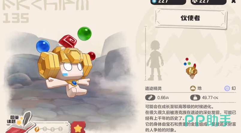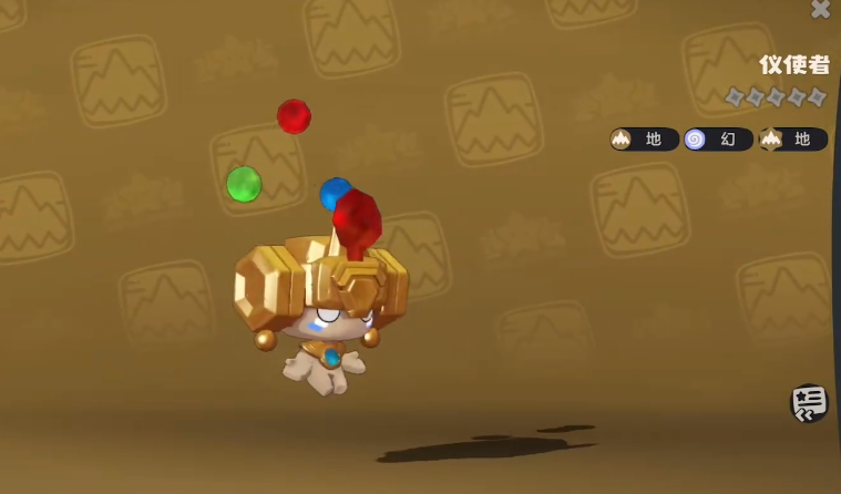 仪使者是游戏里的135号精灵,这个精灵的外观非常独特,像一个q版的小人,整个头发造型很夸张,并且呈现的都是黄金一般的光泽,在头上还会有绿,蓝,红三种颜色的圆形宝石,精灵在游戏里有着较高的进化空间,等达到特定等级的时候,就可以进化成人形角色,属于游戏里的地系精灵。