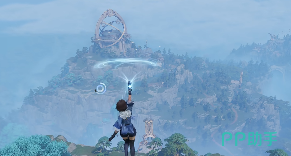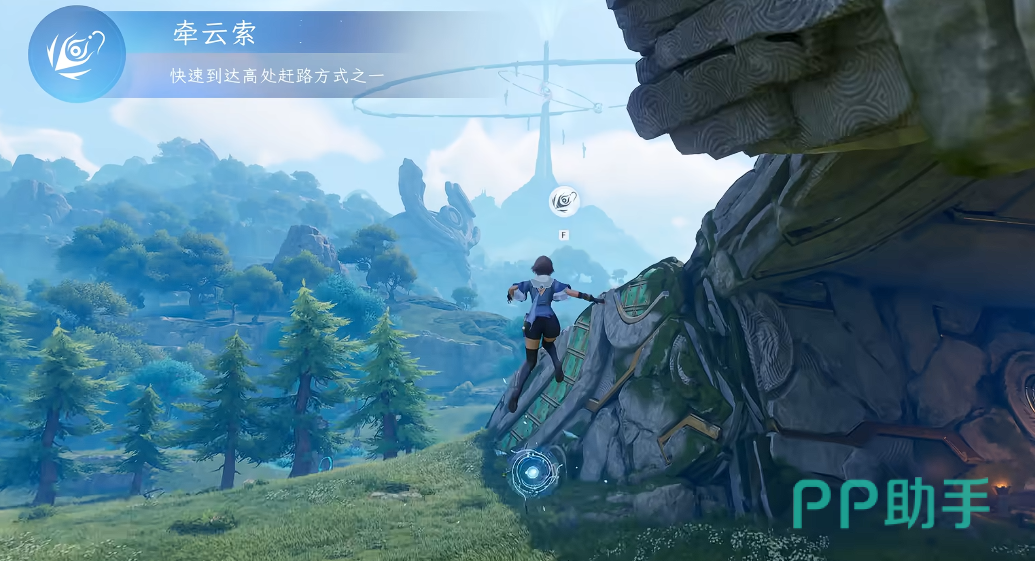 另一高频实用工具为“牵云绳”。当角色视线范围内出现带有蓝色光点标识的锚点装置(通常成对分布于悬崖两侧或高塔之间),长按对应操作键即可发射绳索完成定点牵引。该系统支持多段连续使用,形成空中索道网络,适用于跨越深谷、绕行险峰等场景,是中短距高效位移的关键支撑。