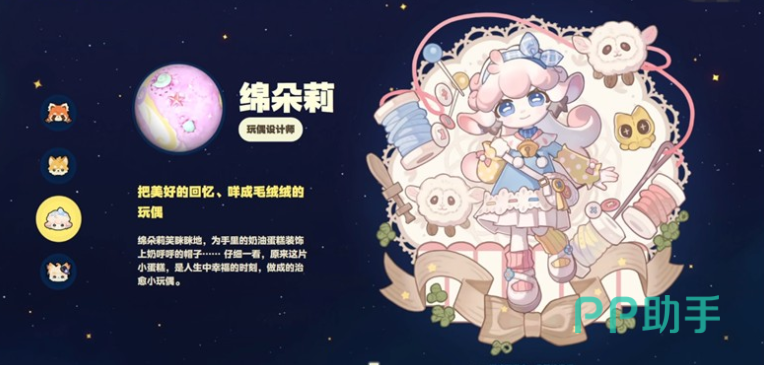 棉朵莉以绵羊拟人形态构建视觉记忆点,粉蓝配色营造出柔和安定的情绪基调。她在任务体系中主要承接服饰修复、手工制作类委托,背景音效常伴有清脆铃铛声——源于其颈间悬挂的传统饰物。所有外观装饰道具(如背包、发饰、围巾)均可通过提交指定材料由她现场制作。该角色实质承载游戏内的“纺织工艺”子系统:玩家可通过与其持续互动习得染色配方、织物强度计算逻辑、以及多层叠加穿搭的属性加成规则,是装扮养成线的核心技能传授者。