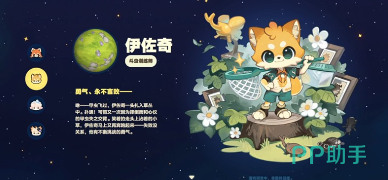 伊佐奇以浅黄色毛色与运动风造型区别于其他狐系角色,手持标志性捕虫网,职业定位为斗虫训练师。其交互机制深度绑定野外探索系统——玩家需先激活“捕虫模式”,方可依据她提供的行为规律提示(如昆虫出没时段、栖息植被类型、天气影响系数)开展高效采集。所获昆虫可用于斗虫对战、图鉴收集及赛事挑战。随着关系等级提升,她将解锁进阶内容:包括不同虫种的驯养周期参数、属性克制关系说明、以及区域限定稀有虫类的触发条件。乐观开朗的性格特质使其成为探索向玩家的重要信息枢纽。