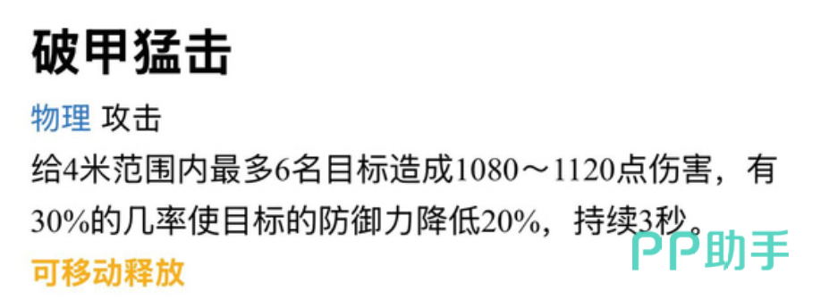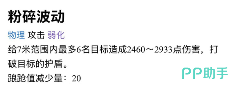 释放后对7米内敌人造成240点伤害,并附带破盾效果。技能强化后,作用范围内敌人数越少,造成的伤害越高,具备更强的单体打击能力。同时,该技能会自动触发后续技能“冲击波动”,形成连贯输出链。
