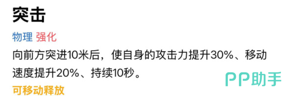 这是一个可在移动中使用的突进类技能,向前冲刺10米,期间攻击力提升30%,移动速度提高20%。技能强化后,突进距离保持不变,但攻击速度额外提升20%,进一步增强近身后的输出节奏。