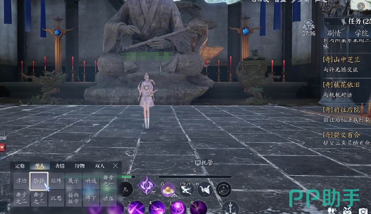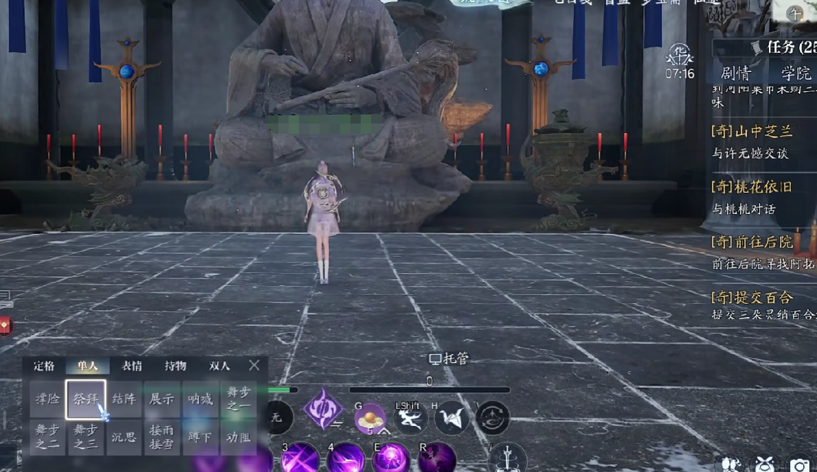 此时,玩家将时间切换到夜间,随后前往到桃林中心位置,找到一尊大佛,该位置可以触发奇遇夜光杯任务,可月亮树下面的佛像在闪烁光芒时候,玩家打开表情功能,通过祭拜的功能,来触发奇遇的前置条件,触发成功之后,玩家进一步的展开祭拜,就能够加快任务的进度了。