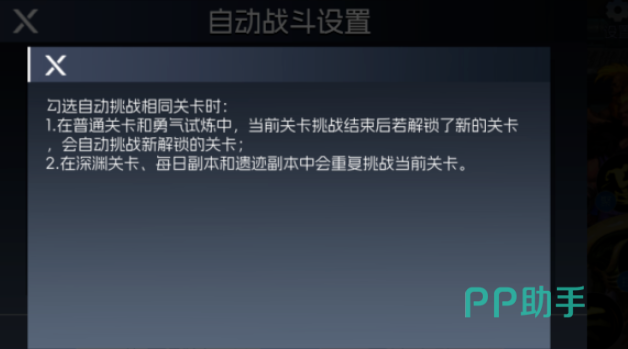 选择“自动挑战相同关卡”后,在深渊、每日副本及遗迹副本中将循环挑战同一关卡;而在普通关卡和勇气试炼中,一旦解锁新关卡,系统将自动推进至最新进度进行挑战。