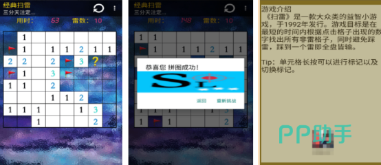经典的玩法适合所有年龄段的人群,在开局之后,玩家将会看到各种各样的方块格子,通过随机点击屏幕的方式,寻找到其中隐藏的数字,但是在此过程中一定要避开雷区,千万不要触碰雷区,否则就会导致游戏失败。虽然操作的方式特别简单,但是却比较考验玩家的智慧头脑,需要仔细推理,才能成功避开雷区。