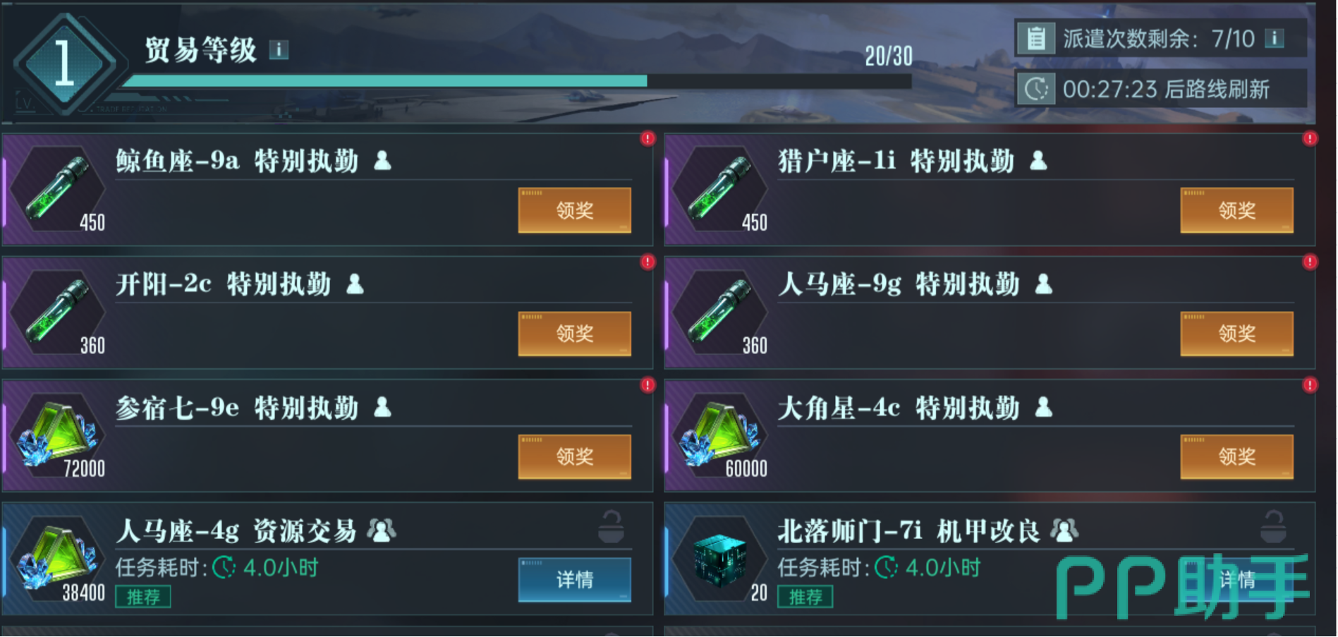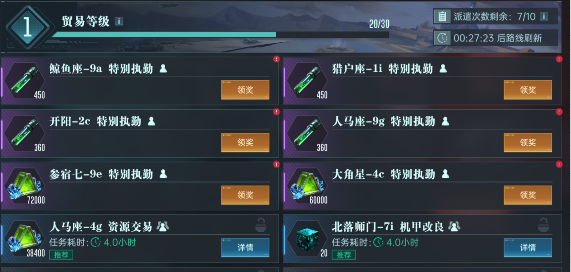 在体验的过程中,可以优先挑选高奖励的任务来体现模组,之后使用贸易许可令令来获得双倍的奖励,高品质的贸易任务基础物资奖励以及耗时还有需要的英雄数量都会不断的增加,非常影响大家任务的成功率,游戏中在开启的时候还会有特殊贸易任务的刷新,帮助大家不占用每日贸易的机会。