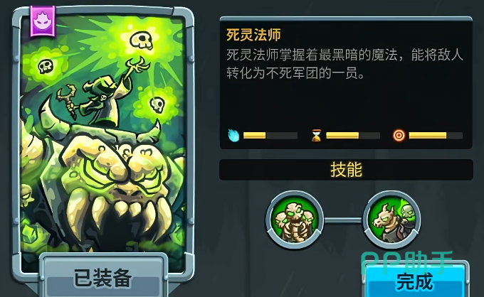 死灵塔作为系列经典单位,在第八关解锁后将成为扭转战局的关键力量。其攻击会在敌人身上叠加一层负面状态,若在该效果持续期间击杀目标,则有几率将其转化为己方骷髅兵,实现兵力反哺。一技能“亡灵图腾”可放置一个持续10秒的图腾,兼具削弱敌人与强化己方双重效果:既对出现的敌人施加诅咒,又使所有骷髅单位攻击力提升50%。二技能“亡灵冲锋”则召唤一名亡灵骑士向前突进,对沿途每个敌人造成60点真实伤害,清线能力出色。