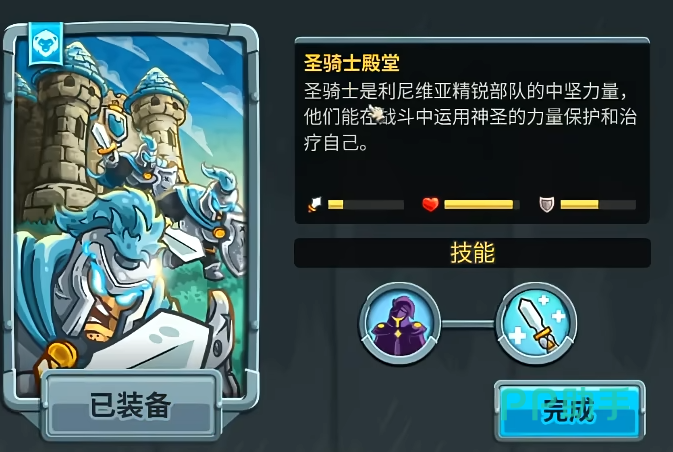 接下来介绍圣骑士殿堂,这座防御塔在早期关卡中扮演重要角色,第二关自动解锁。它属于兵种召唤型防御塔,每次可生成三名圣骑士士兵,这些单位生命值较高但攻击力偏弱,主要用于前线阻挡敌军推进,起到延缓节奏的作用。其一技能“老将激励”能使其中一名士兵升级为老将,为周围友军提供20%的伤害加成光环,该效果同样作用于英雄单位。二技能“祷告”为被动触发技,当任一圣骑士血量低于25%时激活,进入4秒无敌状态并每秒恢复12点生命值,冷却时间较长,需谨慎规划使用时机。
