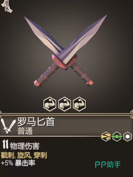 罗马匕首属于双手持握类型的武器,尽管基础物理伤害仅为11点,但具备多种攻击动作,包括戳刺、旋风斩和穿刺等。此外,该武器可带来5%比例型暴击率加成,灵活性较强,适合追求连击节奏的角色构建。