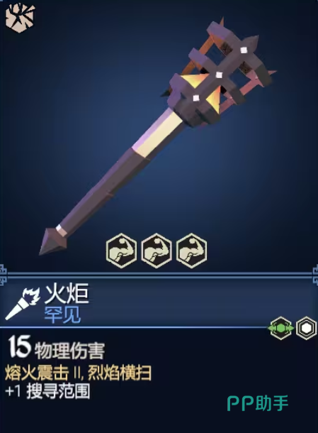 接下来介绍火炬,这是一把蓝色稀有度的武器,提供15点物理攻击力,高于普通白装。其拥有二级震击能力及横扫攻击特性,同时也能提升角色1格的侦测距离,适合需要控制与打断的战斗场景。