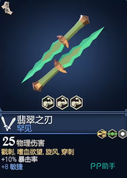 翡翠之刃为罕见品质的双手刃,基础物理伤害达到25点,兼具戳刺、嗜血欲望与旋风穿刺等多项附加能力。暴击率提升10%,并额外提供8点数值型增益,在同类武器中表现突出,适合中后期主力输出角色装配。