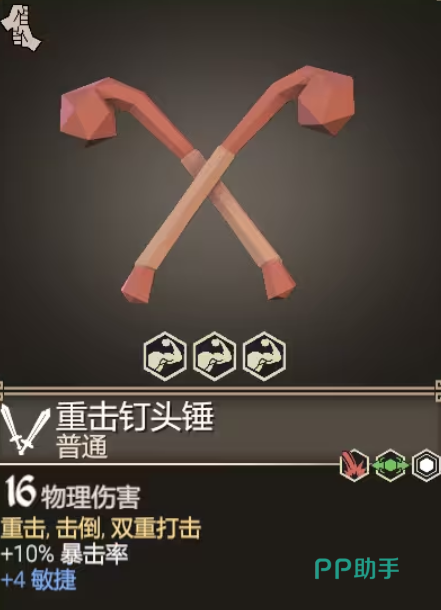 重击钉头锤是一款白色品质的锤类兵器,基础伤害为16点,略高于多数单手武器。在攻击过程中有一定概率触发重击效果,若成功击倒目标,则可追加额外打击次数。同时提供10%暴击率加成与4点敏捷值提升,适合注重稳定输出与控制结合的职业路线。